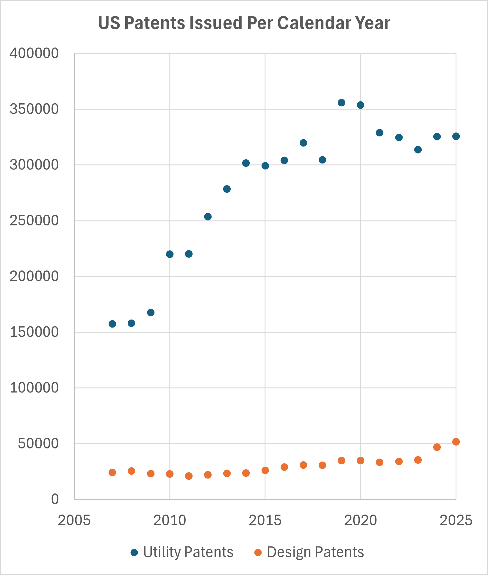 Design patents tell a different story. The 52k design patents issued in 2025 represent a 10% increase over 2024 and mark the highest annual total on record. This growth reflects the continued global importance of design protection, with non-U.S. applicants increasingly seeking design patent rights in the American market. The design patent surge stands in contrast to the flat utility numbers and suggests that different forces are shaping these two branches of patent protection.