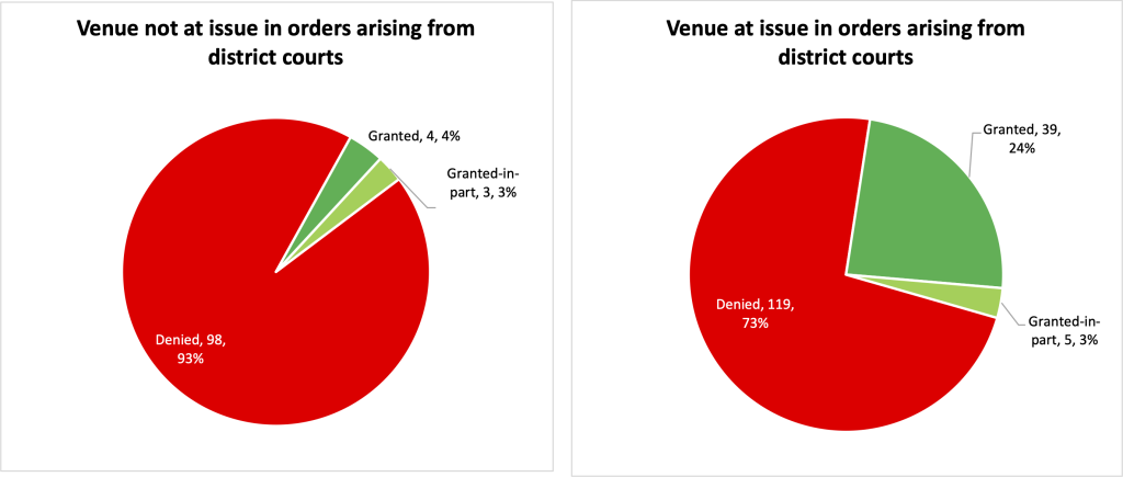 The difference is stark: When venue was at issue, the Federal Circuit decision granted the petition in whole or in part 27% of the time. When venue was not at issue, the grant rate was 7%.